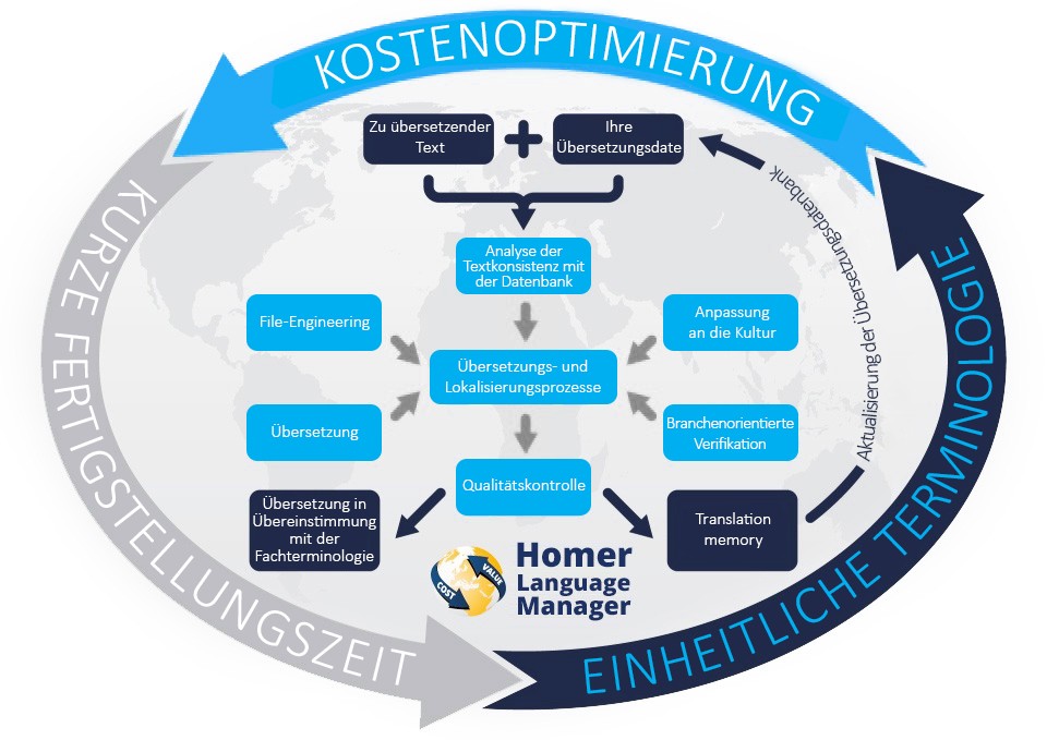 Der Homer Language Manager ist eine Garantie dafür, dass jede bei OMERO erstellte Übersetzung höchsten Qualitätsstandards entspricht. Dank unseres Systems können alle unsere Kunden sicher sein, dass die ihnen zur Verfügung gestellten Dokumente auf der Grundlage der in ihrer jeweiligen Branche geltenden terminologischen Standards übersetzt und überprüft wurden. Der Homer Language Manager gewährleistet, dass die Übersetzungsprozesse von OMERO konsistent und auf die Anforderungen des Kunden zugeschnitten sind.