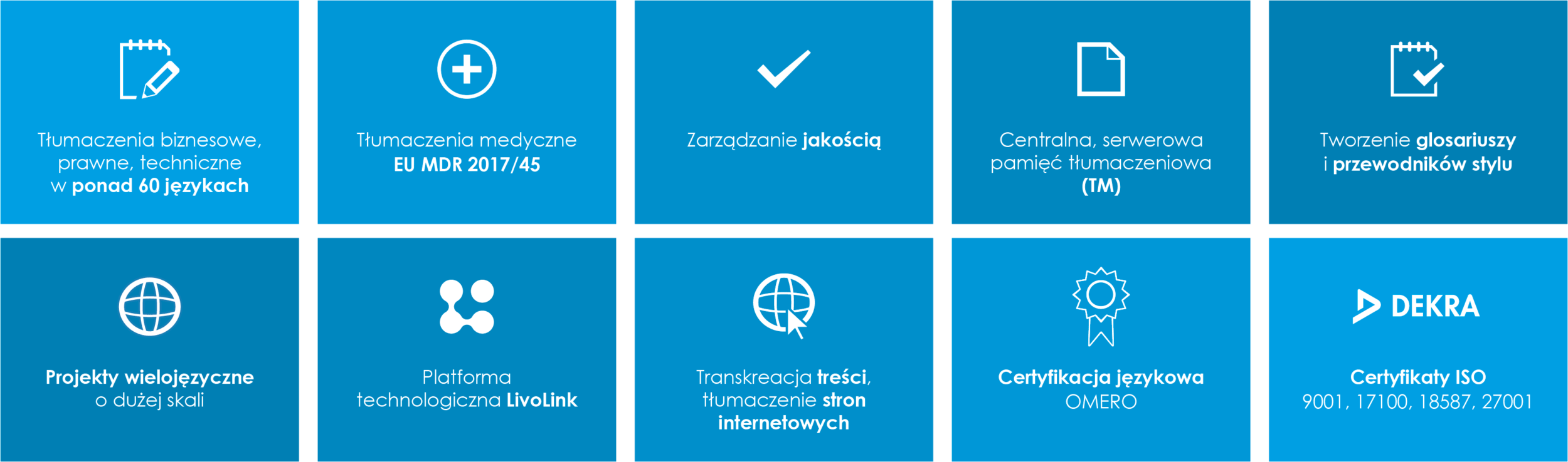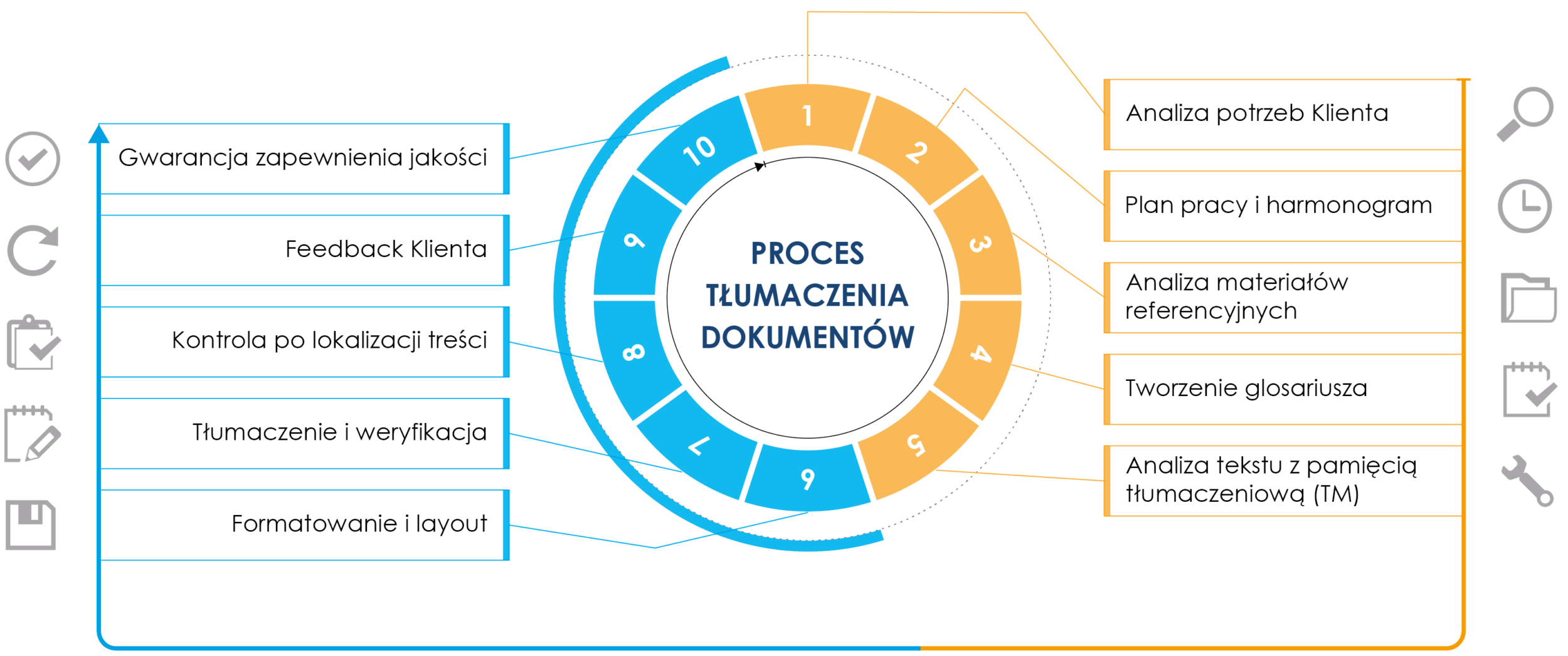 Zapoznanie klientów na rynkach międzynarodowych z Twoją ofertą produktów i usług ma kluczowe znaczenie w osiągnięciu sukcesu biznesowego Twojej firmy. Osiągnięcie tego celu wymaga skutecznej komunikacji w różnych językach, tworzenia wielojęzycznych i wielokulturowych treści zaprojektowanych w celu wzbudzenia zainteresowania klienta i optymalnych pod względem dokonywanych przez niego decyzji zakupowych. Nasz proces tłumaczenia, od analizy projektu do jego wykonania oraz posiadane przez nas certyfikaty ISO zapewniają najwyższy poziom rzetelności wykonywanych usług tłumaczeniowych. Dzięki temu dostarczysz swoim klientom i partnerom biznesowym profesjonalnie przetłumaczoną dokumentację i inne materiały w ich języku.